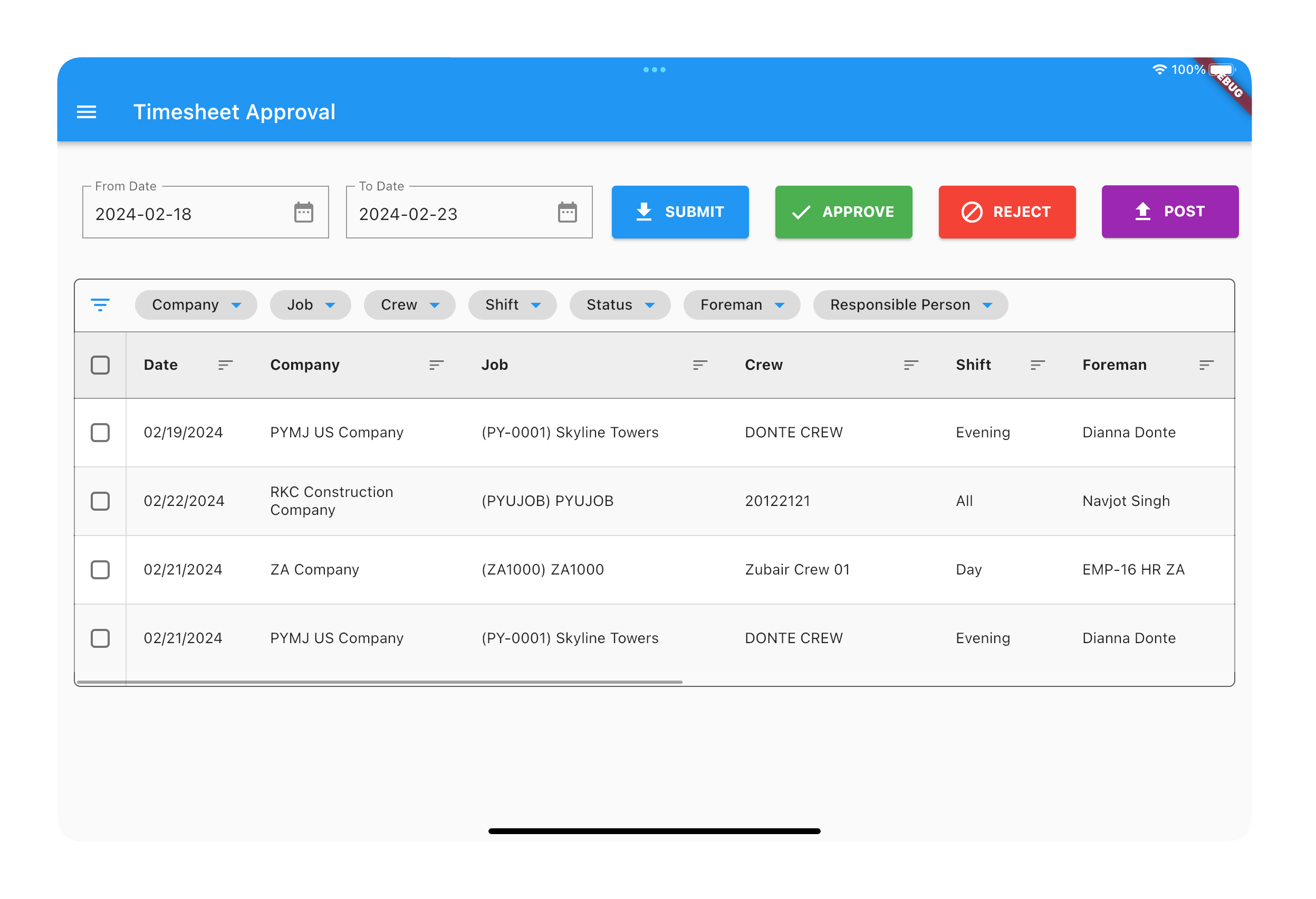 For Project Managers and Crew Leaders, Construct CT offers a transparent window into daily operations. The app facilitates the review and approval of timesheets, providing a module that delivers live updates on crew activities. This real-time visibility ensures that project oversight is both informed and responsive, enhancing team coordination and project delivery.